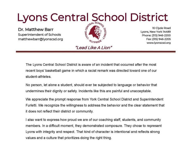 Lyons Central School District officials are condemning a racist remark directed at a student-athlete following Saturday’s boys’ basketball game.
