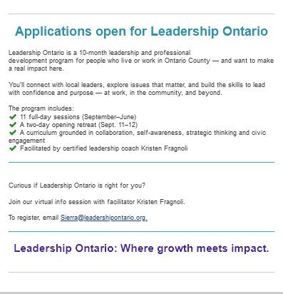 HomeCommunity News ReleasesApplications Open for Leadership OntarioApplications Open for Leadership OntarioTue, July 29, 2025 by Ted BakerSHARE NOW Get the top stories on your radio 24/7 on Finger Lakes News Radio 96.3 and 1590, WAUB and 106.3 and 1240, WGVA, and on Finger Lakes Country, 96.1/96.9/101.9/1570 WFLR.