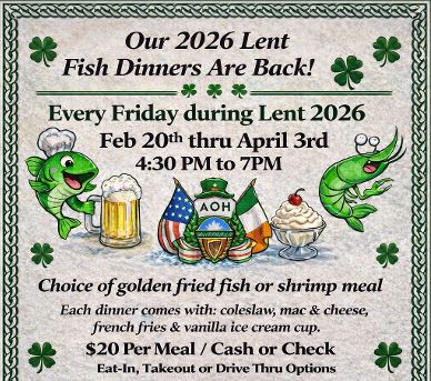 Fabulous fish dinners from Auburn AOH are available for purchase on Fridays during Lent – February 20th thru April 3rd, 4:30-7 pm.