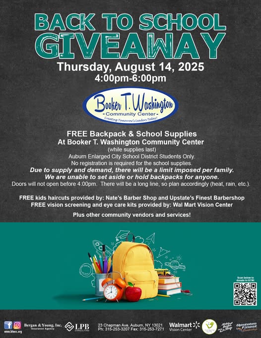 Our annual Back to School Giveaway for students in the Auburn Enlarged City School District will be held at BTW on Thursday, August 14th from 4:00pm to 6:00pm.