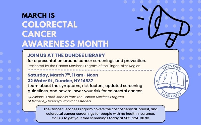 This will be a presentation and conversation for community members to learn more about colorectal cancer at the Dundee Library. This is open to all community members to learn more about colorectal cancer. The Cancer Services Program of the Finger Lakes Region will be conducting the presentation and guiding conversation amongst the group. The Cancer Services Program covers the cost of colorectal, breast, and cervical cancer screenings for people with no health insurance.