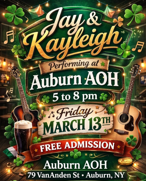 Jay & Kayleigh perform at Auburn Ancient Order of Hibernians from 5 to 8 pm on Friday, March 13, 2026.