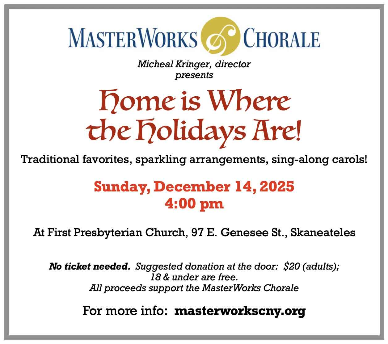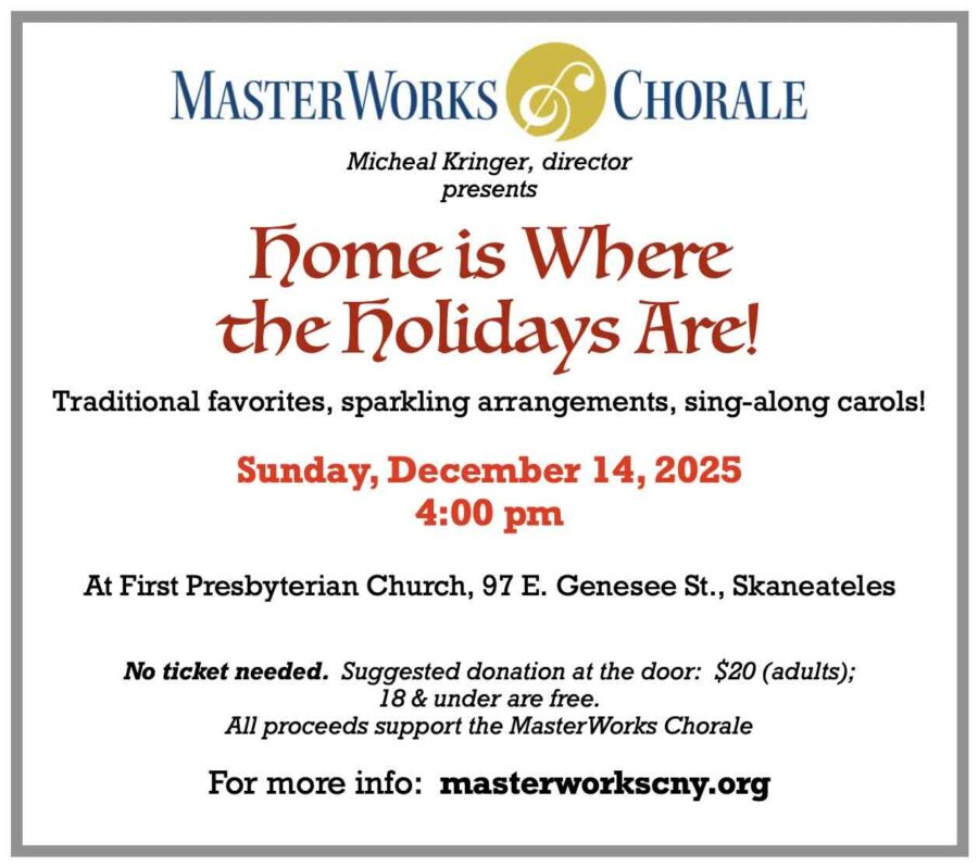 Home is Where the Holidays Are! Traditional holiday favorites, sparkling arrangements and sing-along carols. Micheal Kringer, director. Sunday, December 14, 2025 – 4:00 pm. Join us for this annual holiday concert to ring in the season!!!
