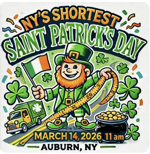 Rain, snow or sunshine, come join us for New York State’s Shortest St. Patrick’s Day Parade on VanAnden Street in Auburn. The parade is open to everyone to participate. Please line up at the corner of VanAnden and State Streets and prepare for the short 291-foot parade route which ends at the Auburn AOH building.
