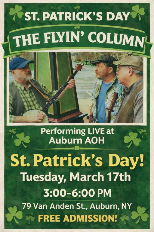 Come celebrate St Patrick’s Day with awesome Irish music from The Flyin’ Column. This concert is open to the public and is a free admission event.