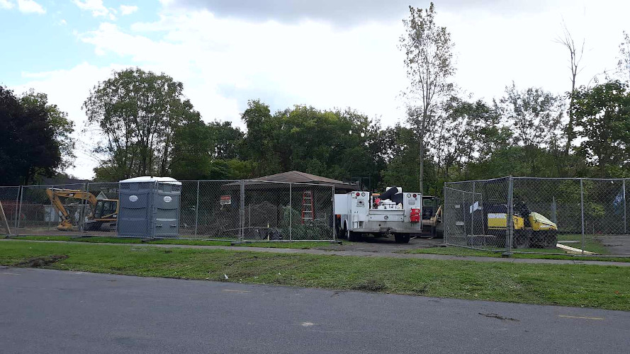 Phase I of the project was completed by Titan Development Inc. from Gasport, New York. That phase consisted of demolition and clearing of the old playground, grading and drainage, and the installation of an asphalt walkway, a picket fence by the riverbank, a swing set, and benches.