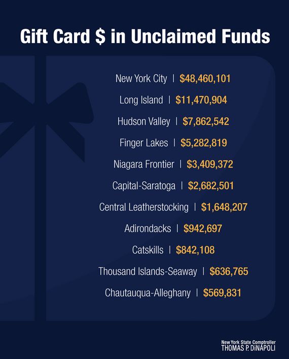 “Tis the season of giving, not losing, so please spend those gift cards and check to see if you have unclaimed funds,” DiNapoli said. “Many New Yorkers don’t realize gift cards may have their balances transferred to the Office of Unclaimed Funds after five years of inactivity. Last year, we recovered over $21 million worth of lost money from unspent gift cards.”
