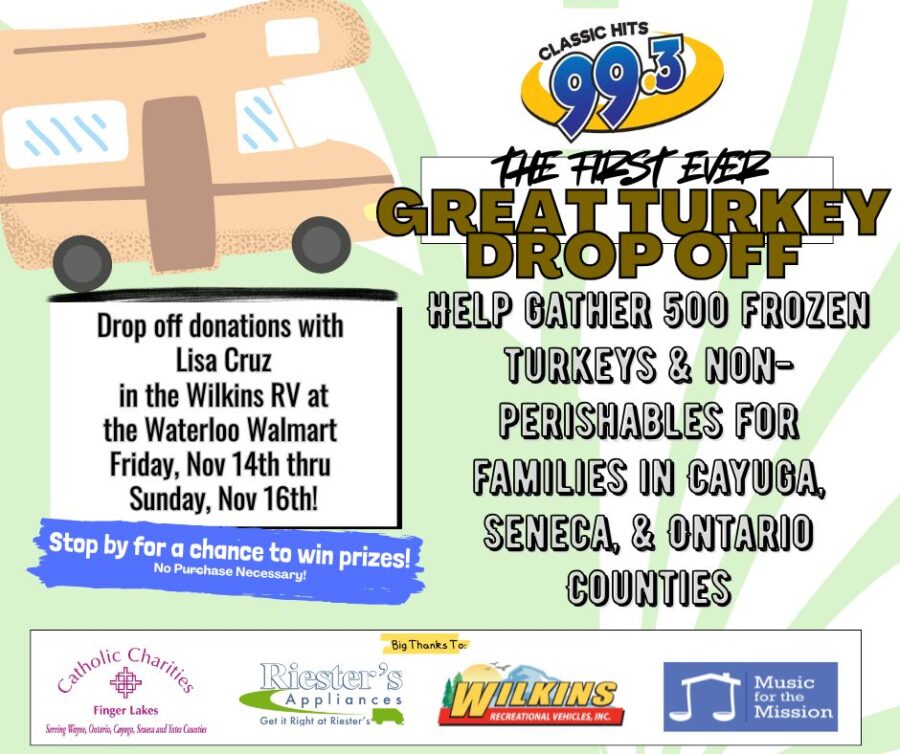 The “1st Ever Great Turkey Drop-Off” is coming to Waterloo this weekend, with FLX Local Media’s Classic Hits 99.3 joining forces with Wilkins RV, Reister’s Appliances, Catholic Charities of the Finger Lakes, and Music for the Mission to help feed local families for Thanksgiving.