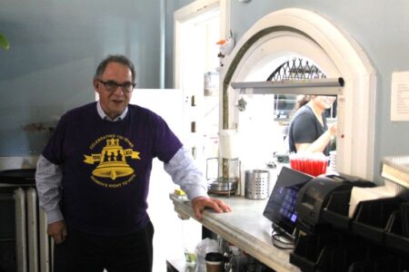 Seneca Falls Attorney Emil Bove stands at the restaurant window where Stanton and Anthony used to by their railroad tickets.