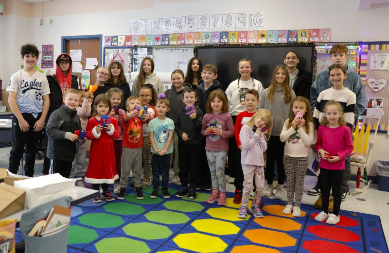 Ellen Lincoln (Class of ’31) helped bring the multi-colored critter with ears and a big smile from idea to reality for young Paisley, part of a collaboration between Jocelyn McConnon’s Family and Consumer Science (FACS) class at the Secondary building and Jen Baxter’s Kindergarten class.
