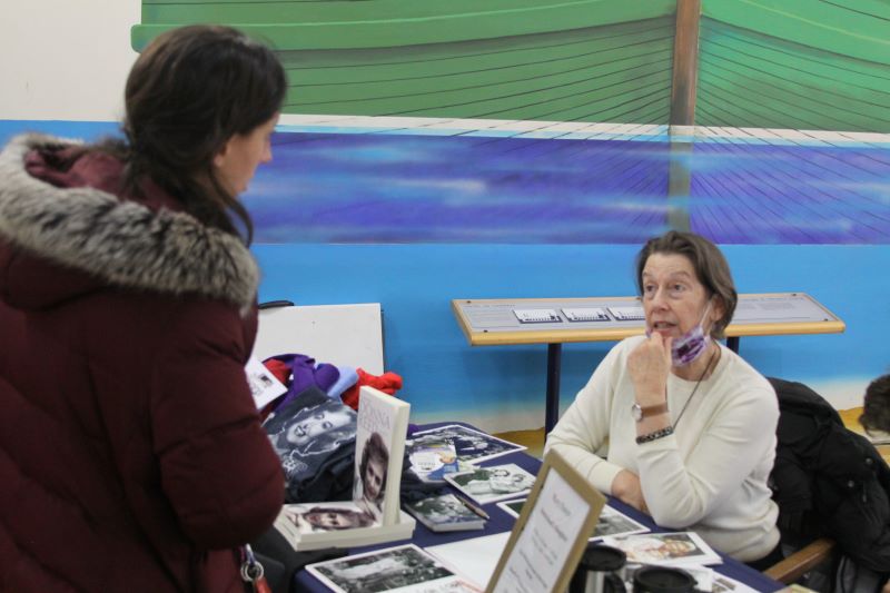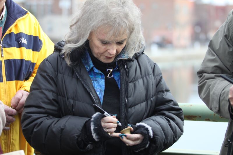 Karolyn Grimes on the Bridge Street Bridge signs a bell in memory of Generations Bank President and CEO Menzo Case.