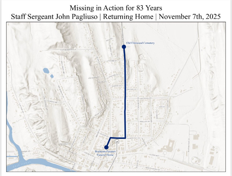 His remains were buried as unknown in the U.S. cemetery in Manila for decades. In 2021, the Defense Department exhumed the remains and used DNA from his family to confirm his identity. He was officially accounted for earlier this year. Full military honors will be given at his funeral on Friday at 11 a.m. at Old Elmwood Cemetery in Lyons. You will find a photo of the route that will be taken on Friday, as Mr. Pagliuso’s remains will be brought to the Cemetery for burial.