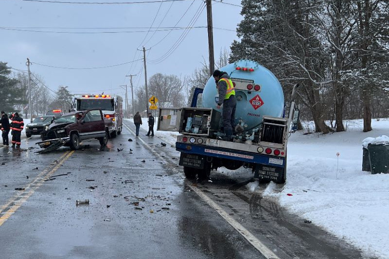 Auburn Road in the town of Seneca Falls was shut down for about 90 minutes Friday morning for an accident involving a pick-up truck that collided with the back of a propane tanker.