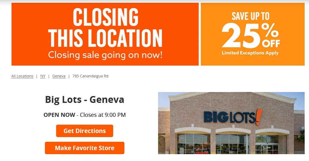 The Big Lots website has added its Geneva location to its list of stores closing. An exact date for the closure of either the Geneva or Canandaigua location has not been revealed.