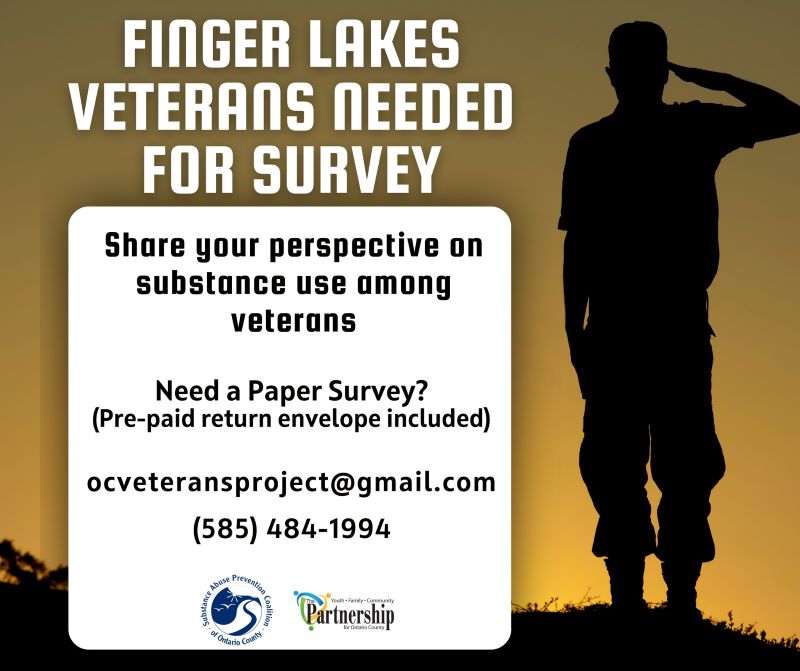 The Coalition is inviting those who have served in the armed forces and are now living in Ontario County or surrounding counties to share their perspectives on substance use among veterans with us by completing this anonymous survey.