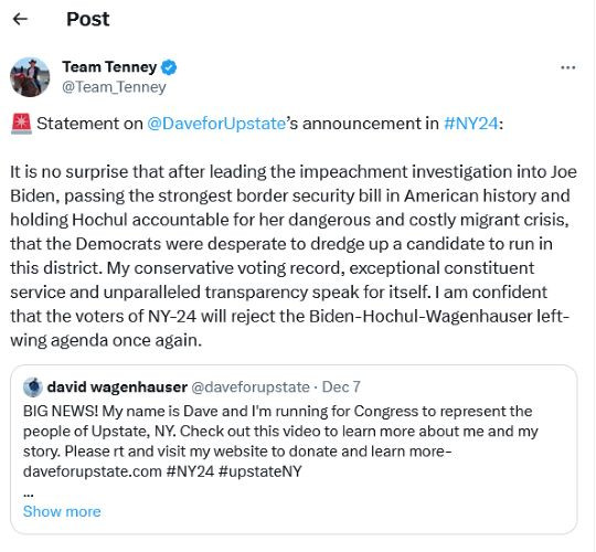 Wagenhauser launched his website (DaveforUpstate.com) and released a video to announce the kick-off of his campaign. “It’s time Claudia Tenney came home.”  He continued, “Tenney has become more interested in fighting partisan battles, booking TV and radio time, and inciting social media outrage, than in working to solve the problems she complains about daily.”