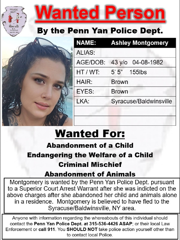 43-year-old Ashley Montgomery is wanted by the Penn Yan Police Department under a Superior Court arrest warrant. She was indicted on charges including abandonment of a child, abandonment of animals, criminal mischief, and endangering the welfare of a child.