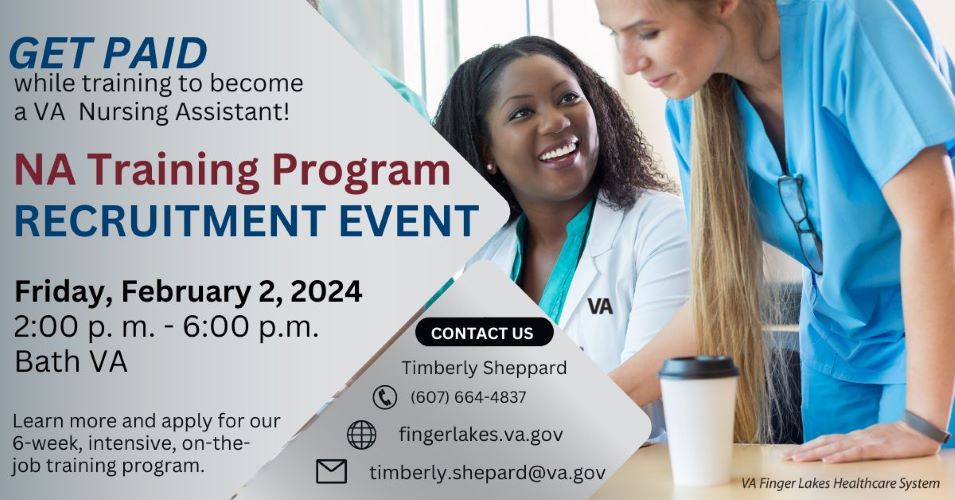 The VA Finger Lakes Healthcare System is hosting a recruitment event at the Bath VA Medical Center on Friday for its new, paid Nursing Assistant training program