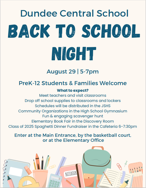 Dundee Central School will hold its second annual Back to School Night on August 29th. Organizers say the event is a chance for Dundee students, their families, faculty, and staff to come together, and build strong partnerships between home, school, and community. It will allow students and families to meet teachers, visit classrooms, and serve as a chance to drop off school supplies for the upcoming school year. The event will also allow families to explore multiple community resources.