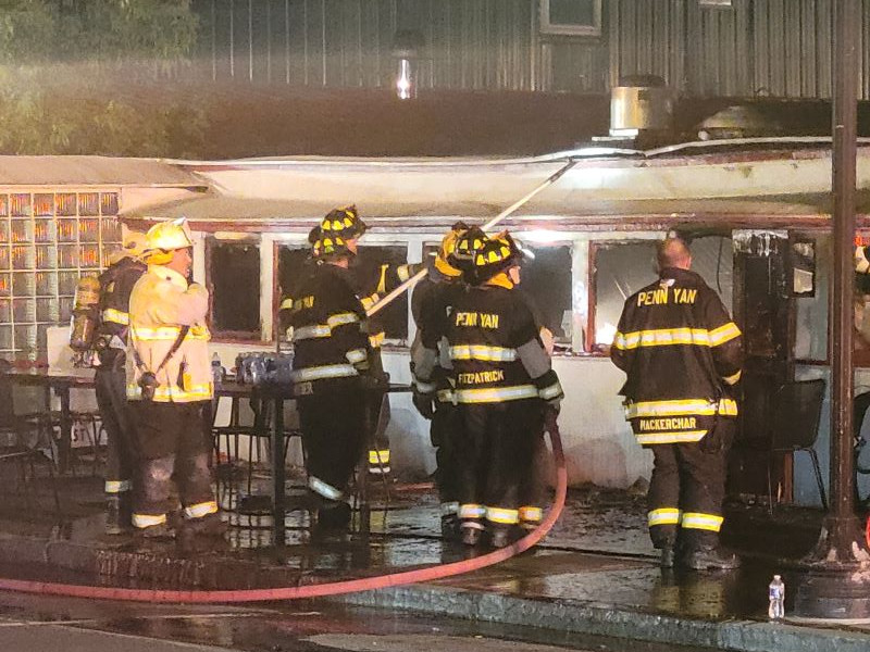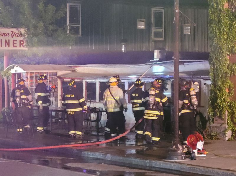 Just before midnight, Yates County 9-1-1 received an alarm from the Penn Yan Diner. Penn Yan Police Sergeant Corey Grace was the first person to arrive on the scene and reported heavy smoke pouring from the 99-year-old East Elm Street diner. When the first units arrived on the scene, they confirmed a working structure fire coming from the trolley-shaped eatery. (see photo gallery below)