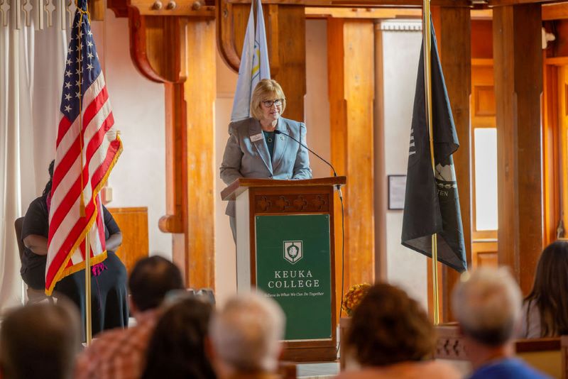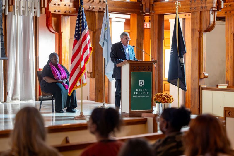 The veterans were introduced by Keuka College Coordinator of Inclusion & Belonging Gabrie’l Atchison. Also taking part in the ceremony was Interim Vice President for Student Development Dr.Elizabeth Lambert, who joked that she “might not be here” if her parents hadn’t met while serving in the Navy, and College Chaplain and Director of Inclusion & Belonging Eric Detar.