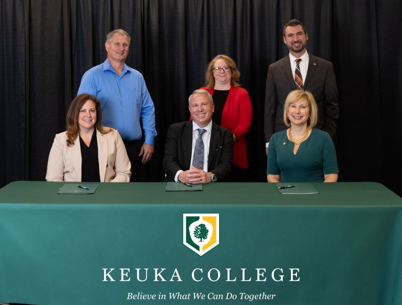 Seated from left, Keuka College Interim Provost and Vice President for Academic Affairs Dr. Heather Maldonado, Lake Erie College of Osteopathic Medicine Associate Dean of Academics Dr. Richard Terry, and Keuka College President Amy Storey, and, standing from left, Keuka College Division of Natural Sciences and Mathematics Chair Dr. Michael Keck, Lake Erie College of Osteopathic Medicine Student Affairs and Regional EAP Coordinator Angela Wood, and Keuka College Vice President for Enrollment Management and Marketing Pete Bekisz (provided)