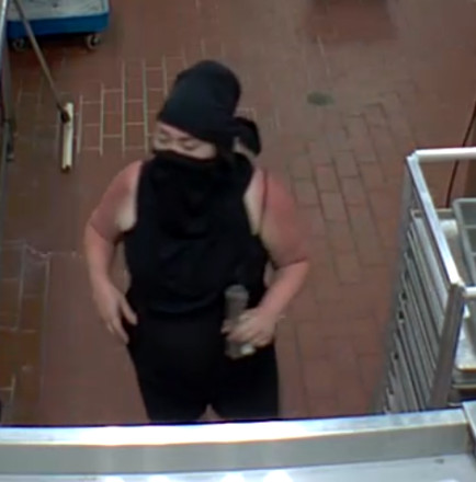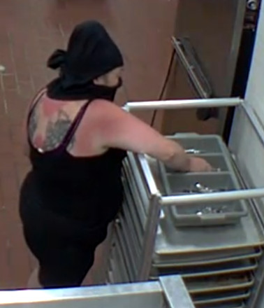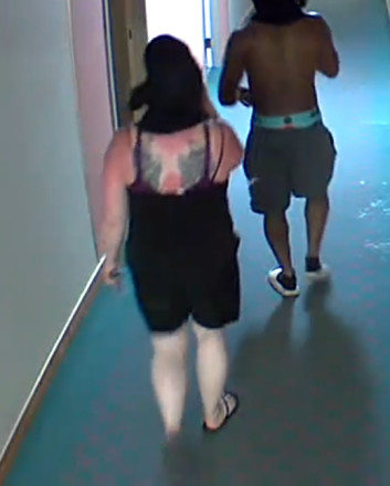 The second suspect is believed to be a white or Hispanic female, wearing a black tank top, black shorts, and flip flops. She has a distinctive tattoo of angel wings across her back. Investigators say the male suspect was heard calling her by the name “Sarah.”