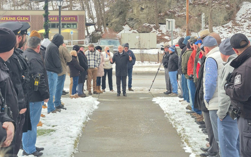 Fazzary, a lifelong Schuyler County resident, began his career in the District Attorney’s Office in 1992 and worked closely with local law enforcement throughout his tenure. On Tuesday, current and retired members of the Schuyler County Sheriff’s Department, Watkins Glen Police Department, and New York State Police honored him with a law enforcement walkout ceremony at the District Attorney’s Office.