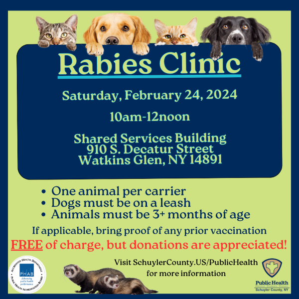 The Saturday clinic will run from 10 a.m. until noon at the Shared Services Building on South Decatur Street in Watkins Glen. Schuyler County Public Health said they will accept one animal per carrier, all dogs must be on a leash and all animals must be three months or older. If applicable, you are asked to bring proof of any prior vaccination.
