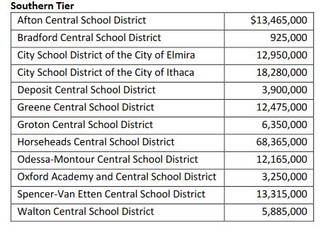 Projects supported by these bonds include classroom additions and renovations, athletic field improvements, energy efficiency upgrades, and safety enhancements. Of the $171 million issued to the Southern Tier schools, Odessa-Montour received $12.1 million and $925,000 went to Bradford school.