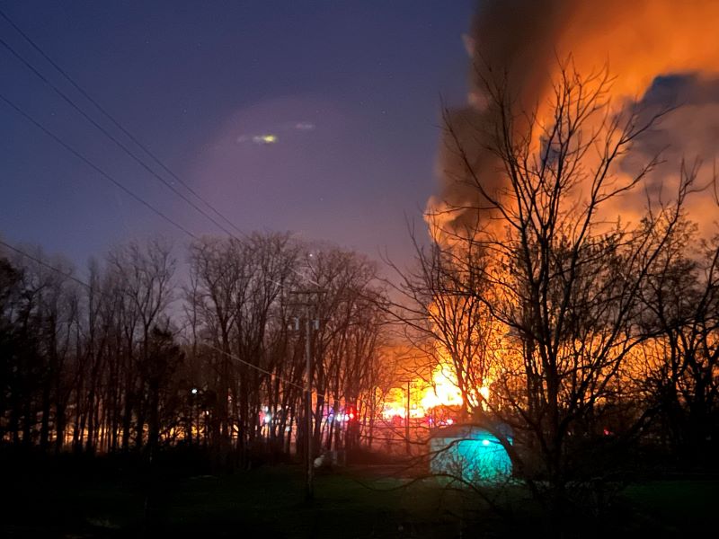 At around 10:20 p.m., Yates County 911 received a phone call from a resident saying they heard a loud explosion and could see flames in the distance. Moments later, a Yates County Sheriff’s Deputy confirmed a working barn fire at 1522 State Route 230 in the area of the Dutch Kuntry Store. A neighboring barn on the property owned by Gerald and Harold Zimmerman also caught on fire with one of the structures collapsing.