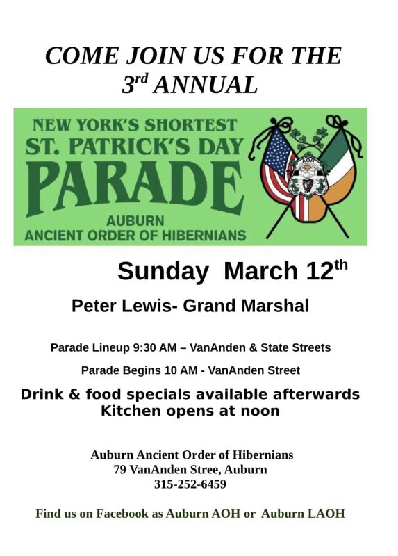 The event is hosted by the Auburn Ancient Order of Hibernians and will begin at 10:00a on Sunday March 12th. The route runs from the corner of Van Anden and State Streets to the Hibernian’s building – a total distance of 291 feet.