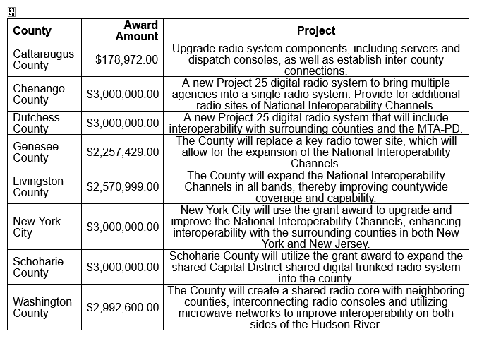 The $20 million in state funding will be administered by the State Division of Homeland Security and Emergency Services (DHSES) under the 2023 Statewide Interoperable Communications Grant (SICG) Targeted Grant Program. The primary objective of the SICG-Targeted program is to close gaps in the interoperability infrastructure, regional communications deficiencies, improve redundancy and resiliency and implementation of National Interoperability channels. All New York State counties were eligible to apply for SICG-Targeted funding. Recipients can use the funding to conduct various emergency communications projects, such as the installation of new equipment, enhancing communication channels among public safety radio systems and training and exercise support to promote interregional emergency communications and first responder readiness.