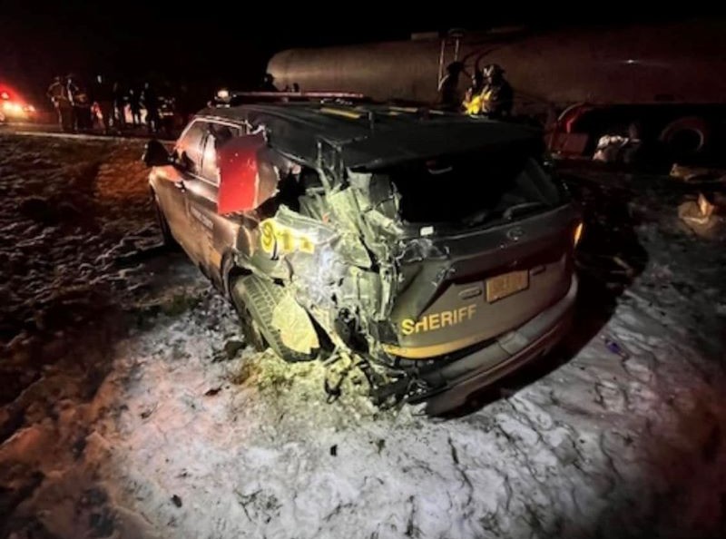 Deputy Kaitlyn Fletcher was parked partially on the shoulder of the road at the rear of a one-car accident in the eastbound lane of I-86 at around 7 Friday night. According to the sheriff’s office, due to poor lighting and the location of the accident, more deputies responded to add visibility and ensure a safe scene. After activating her directional signal to instruct all traffic to move over to the passing lane, the milk hauler reportedly failed to do so and struck the driver-side rear of the patrol car, sending it off the shoulder of the road and down an embankment, causing extensive damage.