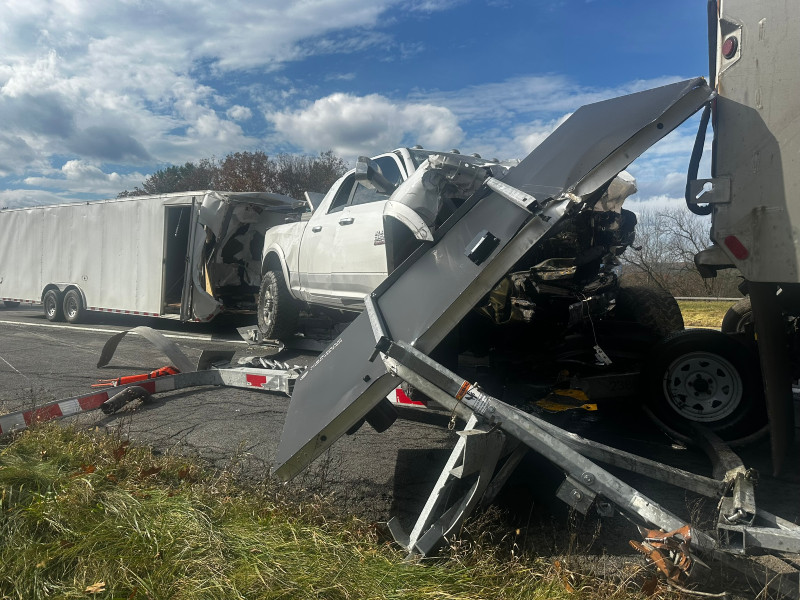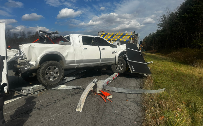 State Police say it happened around 10:43 a.m., when a Dodge 3500 pickup pulling a trailer carrying picnic tables crashed into the back of a DOT attenuator truck in the eastbound lanes.