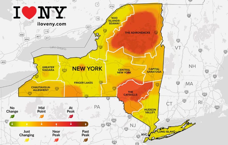 Gorgeous peak foliage will be arriving throughout most of the Adirondacks this weekend, as well as in many parts of the Catskills, while leaves in other parts of the state will generally range from just changing to midpoint of change. This is according to the field reports from more than 85 volunteer observers for the Empire State Development Division of Tourism’s I LOVE NY program.