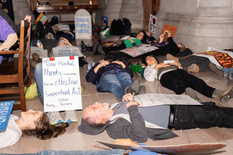 As the State Legislature negotiates with Governor Kathy Hochul over her proposed Climate Change Superfund Act amendments, New Yorkers embark on day 2 of a three-day Sit-in, Teach-In, Sing-in, and Youth Die-in at the State Capitol. Attendees demand Hochul sign a strong bill based on climate justice and fiscal fairness to make polluters pay for climate crisis costs. The bill would require large fossil fuel companies to pay $75 billion over 25 years for climate damage repair, resilience, and protection programs.