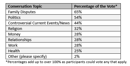 While family disputes may not be surprising at 65%, it ranked number one in New York. Coming in a close second, with the US Presidential Election approaching in 2024, many Americans are deciding to avoid this topic during conversations next week. After all, who wants to hear about your parents’ political views when bringing your girlfriend home to meet the family for the first time?