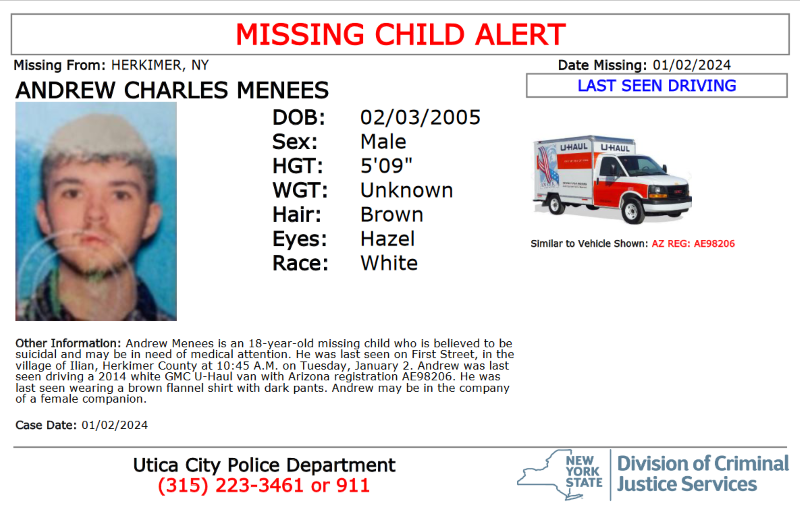 At the request of the Utica City Police Department, a New York State Missing Child Alert has been issued relating to the disappearance of 18-year-old Andrew Menees, of Herkimer.