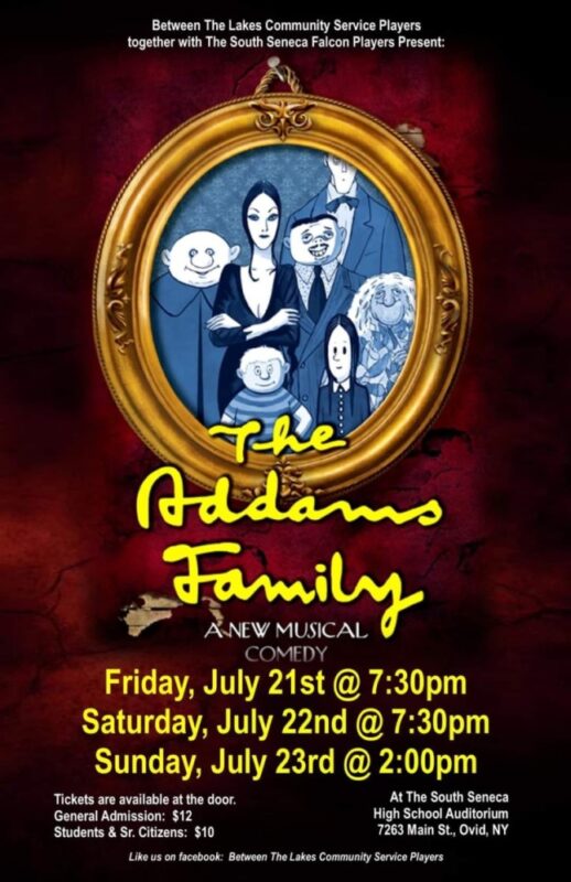 - The Addams Family, July 21,22 and 23 at the South Seneca High School auditorium.